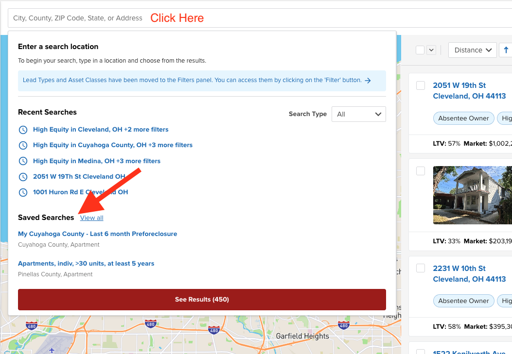 To access the 'Saved Searches', click on “Where would you like to invest?” just above the map.
